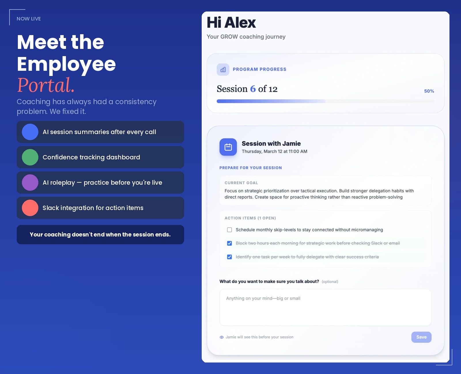 The new Employee Portal is designed to close that gap. After each coaching session, participants receive AI-generated summaries of key themes and takeaways, making it easier to reflect and build on what was discussed. A personal confidence tracking dashboard shows how growth has evolved across the entire coaching engagement. Progress becomes a visible metric, not just a feeling.