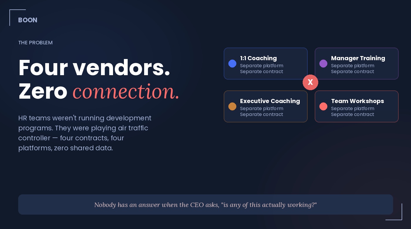 The typical setup looked something like this: one vendor for manager training, another for executive coaching, a third for team workshops, and Boon on the side for 1:1 coaching. Four different contracts, four different platforms, four sets of data that never talked to each other.