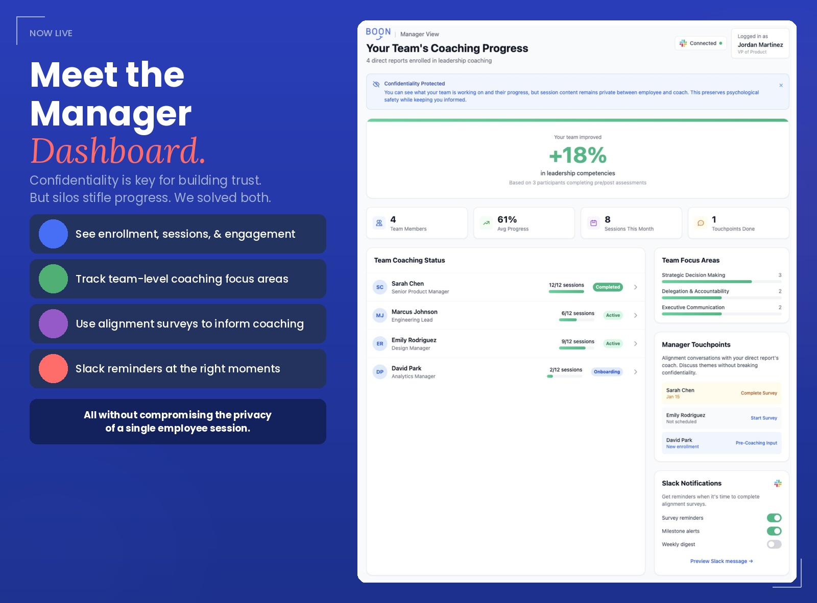 The new Manager Portal changes that dynamic without compromising confidentiality. Managers can now see which direct reports are engaged in coaching and track their overall progress without accessing any private content from session data. Slack-based feedback reminders ensure that the manager's perspective is captured during programs so their insight informs the development process rather than sitting outside it entirely.